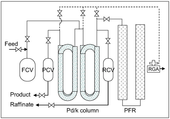 The TCAP works similarly to gas chromatography, but it utilises columns filled with palladium on kieselguhr that exhibit a large isotope separation efficiency when operated under temperature cycling. As shown in Figure 5 [35], the TCAP system mainly consists of: (i) a Pd/k column divided into two sections (product and raffinate) with the feed point located in between and (ii) a plug-flow reverser (PFR) packed with kieselguhr.