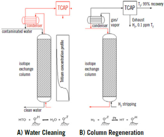 A new process for the decontamination of tritiated water consisting of a hydrophilic column and a TCAP unit has been developed at the Savannah River National Laboratory, as shown in Figure 8 [47,48]. It works along three steps: (i) the tritium contained in the contaminated water is absorbed in the hydrophilic column, (ii) the absorbed tritium isotopes are exchanged by stripping the column with a gaseous hydrogen stream, and (iii) the tritium is separated by the hydrogen in the TCAP unit. Such a process does not require distillation units or electrolysers and, therefore, exhibits modest energy consumption while the presence of the TCAP unit can guarantee the achievement of high separation performances (99% T recovery and T concentrations in the H2 exhaust stream of less than 0.1 ppm).