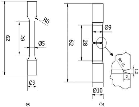 According to ISO 6892-1:2017 [], tensile tests were performed on cylindrical, smooth and circumferentially notched specimens, whose geometries and dimensions are shown in Figure 1. An Instron 5582 tensile testing equipment was used for the experiments. The notch cross-section radius was 2.5 mm, and the notch depth and radius were 2 mm and 0.2 mm, respectively. The notched specimen’s stress concentration factor, kt, was 3.71 [].