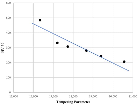 The effect of tempering is better shown, representing the hardness versus the tempering parameter, which considers both temperature and time, with T expressed in K and time in hours: