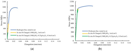 Figure 4 shows the stress–strain plots recorded with these grades. The sample quenched and tempered for only three minutes at 600 °C, with a hardness of 484 HV, was fully embrittled in both hydrogen environments, with failure taking place in the elastic region, well below the yield strength obtained in the hydrogen-free test (Figure 4a). The corresponding ultimate tensile strength suffered huge reductions: 51% without and 79% with the arsenic oxide in the electrolyte. Maximum embrittlement indexes of 100% related to the reduction in area were obtained.