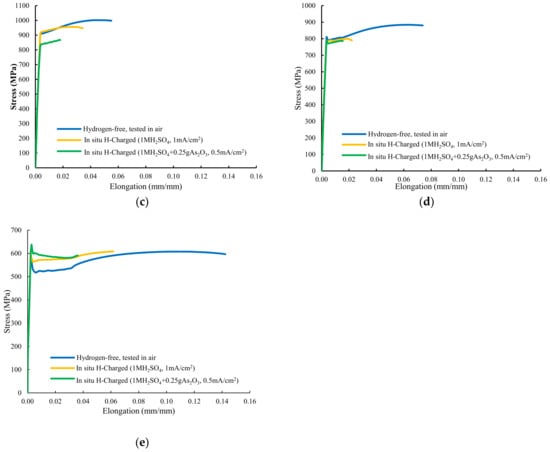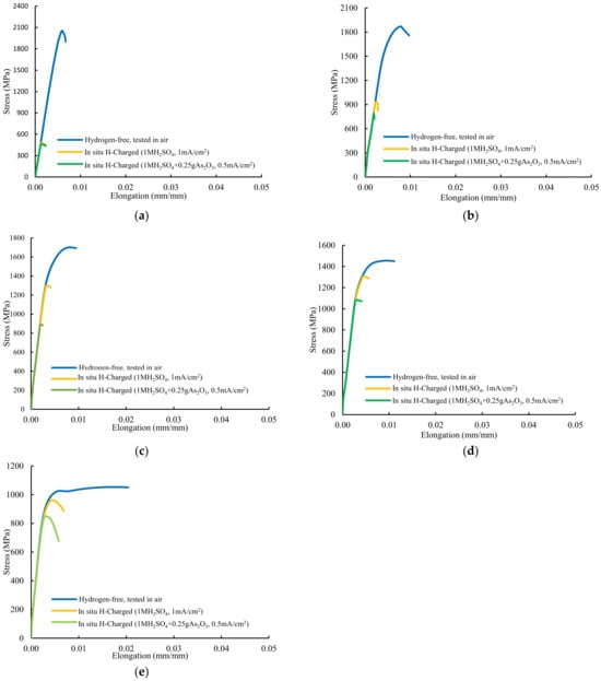 In both hydrogenated conditions, with the sample tempered at 600 °C for 30 min (Figure 4b), failure only occurred at the end of the elastic region, with no plastic deformation. High hydrogen embrittlement indexes related to reduction in area were again observed in this grade (65% and 70%). Nevertheless, HEIs related to the strength were low (9–10%). Samples tempered at 600 °C for 2 h and 24 h suffered some plastic deformation before failure in both hydrogenated media (Figure 4c,d). A marked reduction in area was detected in tests with simultaneous hydrogen charging. Finally, Figure 4e shows the stressst–rain plot of the sample tempered at 725 °C for 4 h. An increase in the yield strength was detected (solid solution hardening due to hydrogen) but, even with this low-hardness, fully tempered microstructure, high hydrogen embrittlement indexes related to reduction in area were calculated in both hydrogen media (63% and 83%).