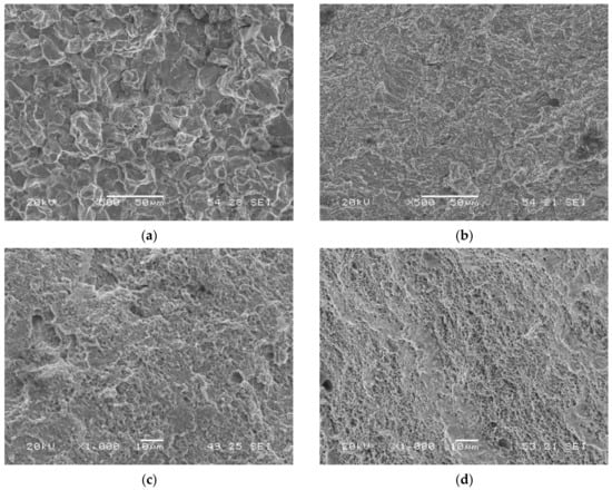 A notable change in the operative failure micromechanism took place when these grades were tested with simultaneous hydrogen charging. Quasi-cleavage (QC) was the main operative failure micromechanism in highly hydrogenated conditions, but intergranular failure (IG) was also observed in the grade with the highest hardness, tempered for the shortest time: QT600-3m (Figure 6a). When the electrolyte without arsenic oxide was used, QC was also the operative failure micromechanism in most cases, but MVC was also observed in QT600-24h and QT725-4h steel grades (Figure 6c,d).
