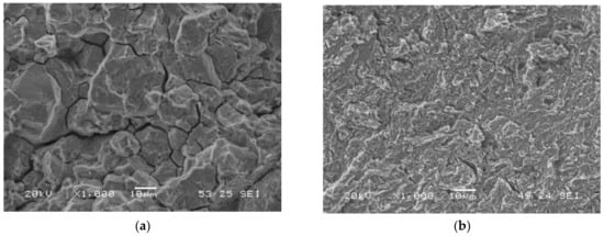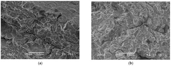 Microvoids’ coalescence (MVC) was the failure micromechanism in all notched tensile test carried out in air, whereas quasi-cleavage (QC) and intergranular failure (IG) were seen in tests conducted in the two hydrogenated media. When the embrittlement index was greater than 50%, IG was visible, while QC was seen in the remaining grades. A few examples of these micromechanisms are displayed in Figure 8: IG in the sample with maximum hardness (QT600-3m) and QC in the fully tempered sample (QT725-4h). Figure 9a,b show the failed surface of QT600-30m tested in the two hydrogenated media. A slight increase in the intergranular micromechanism is observed when the test was performed in the high-hydrogenated medium (with As2O3).