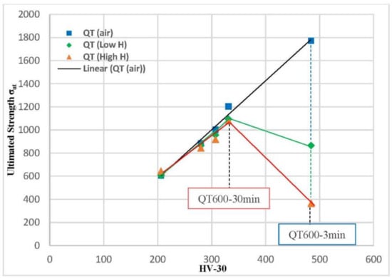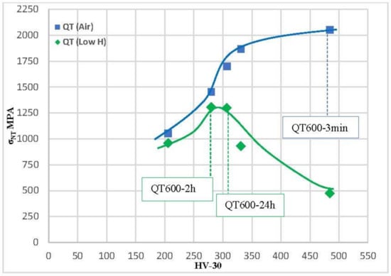 The ultimate tensile strength values (σts) for smooth tensile samples of all quenched and tempered (QT) grades evaluated in air, under low-hydrogenation (mild H), and strongly hydrogenated (high H) conditions are plotted against HV30 hardness in Figure 10. In all the tests performed in air (blue squares in Figure 10), the ultimate tensile strength is directly proportional to the steel’s hardness: a greater hardness corresponds to higher tensile strength. The effect of hydrogen on the ultimate tensile strength measured in these grades is generally very low, with the exception of the significant decrease observed in the grade with the highest hardness (quenched and tempered for 3 min, 484 HV). Under both hydrogenated conditions, the highest ultimate tensile strength was obtained with the quenched grade tempered at 600 °C for 30 min (1094 and 1079 MPa under low and high hydrogen, respectively). Results in the same line were obtained by different authors using different steels and hydrogenated conditions (pre-charged specimens and gaseous hydrogen charging) [,,].