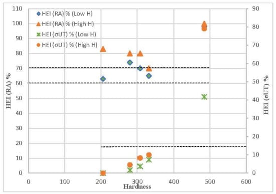 The hydrogen embrittlement index (HEI) was used to quantify the degree of hydrogen embrittlement. The HEI ranges between 0% (no embrittlement; XH = X) and 100% (maximum possible hydrogen embrittlement; XH = 0):