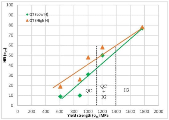 Since yield strength is the characteristic that is usually used to evaluate hydrogen embrittlement and design structural components, Figure 14 plots the hydrogen embrittlement indexes that were obtained with all these grades in both high- and low-hydrogenated conditions against the yield strength of these steels. The quenched and tempered grades show a reasonably linear increase in these indexes along with the yield strength in both hydrogenated conditions. Changes in the operative failure micromechanism, from quasi-cleavage (QC) to intergranular failure (IG), justifies the increase in embrittlement with the steel yield strength. These two failure micromechanisms were also observed in most works related to hydrogen embrittlement, and intergranular failure always corresponds to the most aggressive hydrogen conditions and larger embrittlement indices [,,].