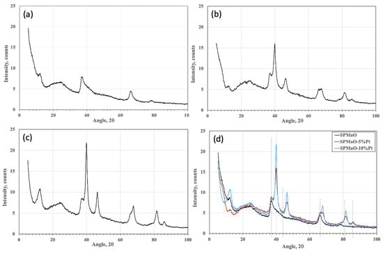 (a) SPMnO, (b) SPMnO-5%Pt, (c) SPMnO-10%Pt, and (d) comparison among all samples.