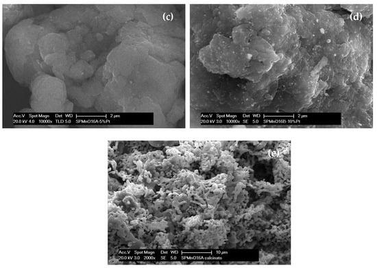 SEM images related to (a,c) SPMnO-5%Pt, (b,d) SPMnO-10%Pt, and (e) SPMnO.