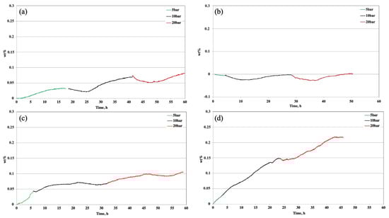 The real contribution of Pt is evident when its percentage increases to 10% (Figure 5d); it is noted that after 50 h, the absorption doubles (over than 0.2 wt%), and the reaction kinetics at all pressures show a higher velocity if compared to the kinetics of the other samples. It can be assumed that the percentage of 5% Pt is not sufficient to catalyze the sorption reaction, even if the pressure is increased above 5 bar, contrary to what happens with a metal load of 10% in which a homogeneity of speed increases in all pressure steps.