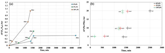 The degree of slope of the half-line provides information on the speed of the reaction; in fact, between one pressure step and the next, the slope of the half-line is more pronounced for the sample with 10% Pt than for the other two samples. A more evident phenomenon occurs when considering the step between 10 and 20 bar, where the slope of the half-line is much steeper, indicating that the reaction is faster than in the other two samples, and the opposite figure also shows the differences in P between the beginning and the end of the step, whose value Δ is 1.04, which is the highest value when compared to the others.