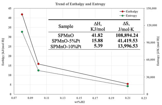 The corresponding straight lines of the three samples were obtained from the slopes and intercepts from where the values of ΔH/R and ΔS/R were derived. Knowing the R constant of the gases, equal to 8.31 J/mol K, the data relating to the enthalpy and entropy variation of the process were obtained. From the data shown in the inserted table in Figure 7, it can be seen that hydrogen absorption is an endothermic process for all of the samples analyzed, but when the Pt percentage increases, the enthalpy variation is significantly reduced. A similar trend can be seen when considering the entropy change, in which the sample at 10% Pt is reduced by about 95,000 J/mol·K.