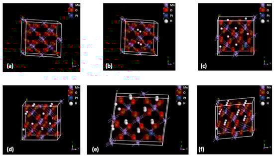 Mn22Pt2O48 supercell (a); supercell containing different H2 atoms (b–f).