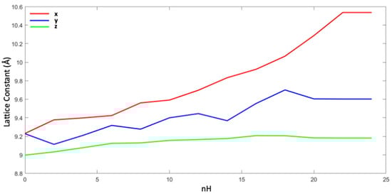 As shown in Figure 9, the size of the Mn22Pt2O48 supercell increases mainly along the y lattice constant, while the smallest variation (about 2% from n = 0 to n = 24) occurs in z. The maximum change in the lattice constant, X, occurs with the insertion of 22 hydrogen atoms, 1.4 Å, while the changes in the constants Y and Z are much smaller considering 18 H, 0.4 and 0.1 Å, respectively. In a percentage value, the lattice variations for the X, Y, and Z constants are 13%, 5%, and 1%, respectively.