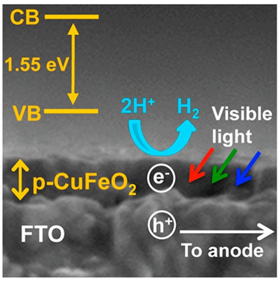 Another pertinent study conducted by Carrier et al. showcased a straightforward electrochemical synthesis method for thin CuFeO2 electrodes. Their research demonstrated the thermodynamic possibility of generating H2 photoelectrochemically while absorbing the whole visible spectrum [95]. Future efforts will concentrate on adjusting deposition conditions; we are exploring alternative techniques for creating CuFeO2 electrodes with optimal thicknesses and morphologies. Additionally, our research involves identifying suitable H2 evolution catalysts for integration onto the surface of CuFeO2 (Figure 4). This strategy attempts to improve the effectiveness of CuFeO2 photocathodes for splitting water using photoelectrochemical techniques [96].