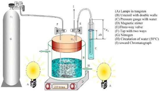 In a notable study, S. Saad et al. investigated the technical feasibility of photochemical hydrogen (H2) evolution by employing a mix of CuCrO2 powder in electrolytes composed of water with various reducing agents (SO32−, (insert another reducing agent), and S2O32−). Electrochemical assessments were conducted at 23 °C using a Pyrex cell fitted with a Pt counter electrode and an electrode made of saturated calomel (SCE). A deoxygenated promoting electrolyte (1 M KOH) was used, and potentials were recorded using a Voltalab 201 potentiostat. The photoactivity experiments were conducted in a 600 mL double-jacketed cell at 50 ± 0.1 °C, which was illuminated by three 200 W tungsten lamps. Gas chromatography was used to identify hydrogen, and a coaxial switched burette was used to estimate its volume. A Jenway 6051 spectrometer was used to calorimetrically quantify the concentration of yellow polysulfide Sn2− at max = 520 nm. Once-distilled water and A.R.-grade reagents were used to make solutions that could be neutralized with Na2HPO4 and NaH2PO4 (Figure 5) [99].