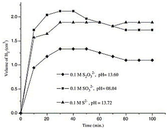 CuAlO2 is a semiconductor of the p type with limited-mobility polarons due to its tiny band gap. Its catalytic aptitude for visible-light-induced H2 generation was studied in connection to the synthesis technique. The conduction band’s potential (−1.63 V versus SCE) is lower than the H2O/H2 level, allowing for spontaneous H2 evolution. Coprecipitation resulted in increases in oxide activity. Maximum H2 generation was reported in a 0.1 M S2− mixture at pH 13.72, with an output rate equal to 0.19 mL h−1 mg−1. As seen in Figure 7, this production increased in tandem with the formation of polysulfide Sn2− (nS2− + 2(n − 1) H2O Sn2− + (n − 1) H2 + 2(n − 1)OH−). Both processes proceeded concurrently, with no observable photoactivity under pH 7, showing that S2− played a critical role. Carriers were transferred iso-energetically between CuAlO2 and the electrolyte, with the help of produced band gap states acting as strong relays [109]. The overall reaction is governed by the momentary arrival rate of electrons at the contact, and the greater thermal photoactivity observed is connected to enhanced electronic mobility [110].