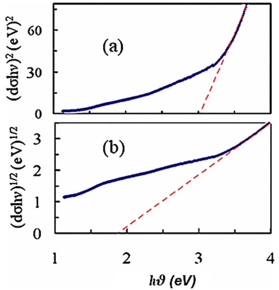 Due to the known influence of CuAlO2 band gaps on material preparation parameters, optical absorption tests conducted on thin layers of CuAlO2 catalyst powders utilized in H2 production experiments were undertaken [112]. Through absorption coefficient measurement, the films formed over a quartz plate formed using a catalyst that was an aqueous mixture produced both indirect and direct band gap values (Figure 9). The direct gap for the CuAlO2 particles used was determined to be 3.01 eV, while the indirect gap was 1.87 eV, making both gaps accessible to solar light. Even though indirect-gap transitions require phonon aid in bulk materials, they may be more frequent in tiny catalyst nanoparticles or at higher temperatures.