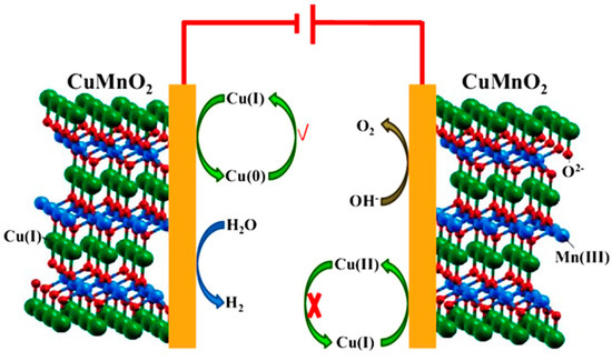CuMnO2 has long been explored as a catalyst, particularly in oxygen and hydrogen evolution (OER and HER) processes. CuMnO2 particles were studied using cyclic voltammetry, electrochemical impedance spectroscopy, and linear sweep voltammetry in a 1 M KOH solution and compared to an Ag/AgCl electrode to demonstrate the possibility of current generation in an alkaline electrolyte with water as an electrolysis process. As proven in this study, the CuMnO2 electrode for OER and HER exhibits more efficient electrocatalytic activity in a three-electrode arrangement on a potentiostat/galvanostat workstation with electrode rotation than without rotation [120]. The calculation of several electrochemical characteristics for the material, such as total charges, charge accessibility, specific capacitance, electroactive surface area, and electrode surface charge change, offered an in-depth understanding of the material’s catalytic behavior. This study’s findings indicate the potential for HER applications in the cathodic area owing to p-type CuMnO2 as well as future research into OER stability in the anodic region, as Figure 11 depicts. The findings of this study might contribute to an upsurge in research interest in these earth-abundant complex transition metal oxides for further electrochemical applications [121,122,123].