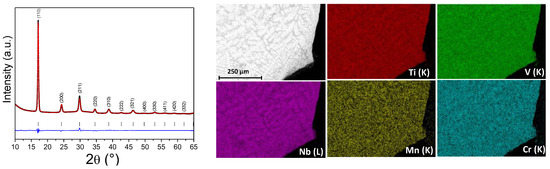 SR-XRD pattern and corresponding Rietveld refinement (λ = 0.67156 Å) (left) and SEM-EDX chemical mapping (right) of the (TiVNb)0.90Cr0.05Mn0.05 alloy.
