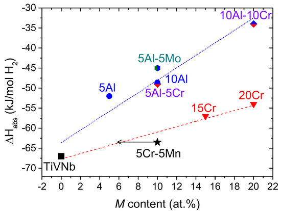 The enthalpy of hydride formation (ΔHabs) in the equimolar TiVNb alloy (square) as a function of additional elements M (at.%): Crx(TiVNb) [26] (triangles), (Al/Cr)x(TiVNb) [27] (diamonds), Alx(TiVNb) [28] (circles), and (Al/Mo)x(TiVNb) (hexagon). The present alloy is represented as a black star. The dotted linear fits are plotted as guides for the eye.