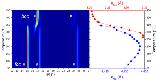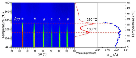 Similarly, the fcc diffraction peaks are visible at low temperatures up to around 260 °C, where the desorbed bcc phase starts to appear. Since XRD reveals mainly the metallic subnetwork, the emergence and evolution of the desorbed bcc phase are now possible. The fcc phase disappears above 350 °C, while the bcc desorbed phase reinforces. The fcc lattice parameter steadily increases with temperature up to around 150 °C, where a decrease is initiated and progressively continues up to 350 °C. The bcc phase appears at around 260 °C, and the related lattice parameter is stable up to 280 °C. Above this threshold, it starts to sharply decrease up to 450 °C, where a stabilization seems to be reached.