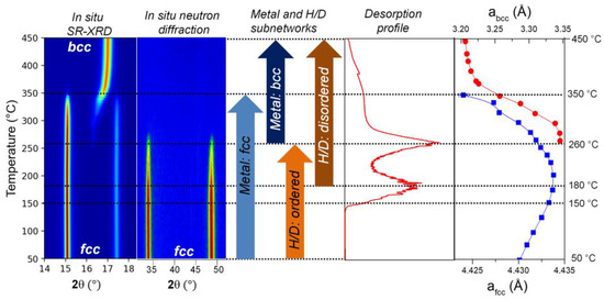 The desorption from the fcc phase (either hydrogen or deuterium) was studied by in situ synchrotron XRD and neutron diffraction during constant heating. Interestingly, due to different probe beam–matter interactions, synchrotron radiation, and neutrons, they reveal complementary information, i.e., the metallic and deuterium subnetworks, respectively. During desorption from the fcc phase, deuterium atoms are well ordered in the tetrahedral sites and start to desorb above 150 °C, whereas they are randomly distributed beyond 260 °C. Above 350 °C, the fcc phase completely disappears. Both experiments agreed well and put forward a reversible phase transformation fcc → bcc that recovers the initial bcc phase, while the H/D subnetwork undergoes an order → disorder transition.