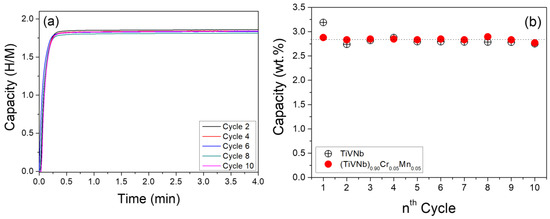 (a) The kinetic curves recorded every second cycle during the absorption step under 25 bar and 25 °C. (b) The reversible capacity (wt.%) during 10 cycles. For the sake of comparison, the results obtained for the TiVNb alloy are also shown in [34]. The mean value at 2.8 wt.% is plotted as a dotted line.
