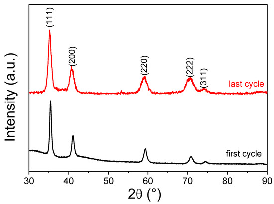 The kinetic curves are comparable, with very fast reaction rates and full hydrogenation within 1 min at room temperature. The reversible capacity is extremely stable, with a mean value of 2.8 wt.% (1.84 H/M) during cycling and comparable to the pristine TiVNb alloy [34]. The XRD diffraction patterns after the first and last cycles are shown in Figure 9. The diffraction peaks from the fcc hydride phase are visible without any secondary phase after cycling. The lattice parameters are similar after the first and last cycles: 4.429(1) Å and 4.441(1) Å, respectively. The only noticeable change in the XRD is the broadening of the peaks after cycling, which points out the formation of defects such as vacancies and dislocations during cycling. This can be related to the stresses developed during the bcc ↔ fcc phase transformation with a large mismatch between the lattice volumes, as proposed earlier in the TiVNbCr alloy [24]. In summary, this alloy shows an excellent reversible capacity, one of the most promising values reported, and a stable chemical composition and crystalline structure without phase segregation.