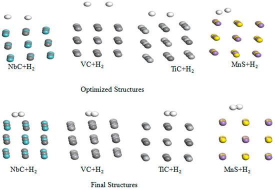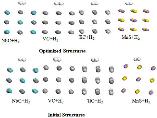 Furthermore, we determined the strength of the interaction of hydrogen atoms with the two layers of NbC, TiC, VC, and MnS using Equation (2).