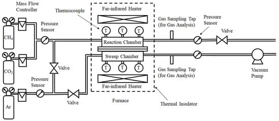 Figure 1 illustrates the schematic drawing of the experimental apparatus of this study. The experimental apparatus consists of a gas cylinder, mass flow controllers (S48-32; HORIBA METRON INC. Beijing, China), pressure sensors (KM31), valves, a vacuum pump, a reactor composed of a reaction chamber and sweep chamber, and gas sampling taps. The reactor is installed in an electric furnace. The temperature in the electric furnace is controlled by far-infrared heaters (MCHNS1; MISUMI, Tokyo, Japan). CH4 gas with a purity of over 99.4 vol% and CO2 gas with a purity of over 99.9 vol% are controlled by the mass flow controllers and mixed before flowing into the reaction chamber. The pressure of the mixed gas at the inlet of the reaction chamber is measured by pressure sensors. Ar gas with a purity of over 99.99 vol% is controlled by a mass flow controller, and the pressure of Ar gas is measured by a pressure sensor. Ar is provided as a sweep gas. The exhausted gases at the outlet of the reaction chamber and sweep chamber are suctioned by a gas syringe via gas sampling taps. The concentration of sampled gas is measured using a TCD gas chromatograph (GL Science, Tokyo, Japan). The minimum resolution of the TCD gas chromatograph and the methanizer is 1 ppmV. The gas pressure at the outlet of the reactor is measured by a pressure sensor. The gas concentration and pressure are measured at the outlet of the reaction chamber and sweep chamber, respectively. The valve is installed at the outlet of the reaction chamber and it is closed when the reaction gas consisting of CH4 and CO2 flows into the reaction chamber. As a result, H2 in the reaction chamber after contacting the Ni/Cr/Ru (Ni/Cr) catalyst penetrates the H2 separation membrane and flows into the sweep chamber. In other words, no H2 flows out of the reaction chamber unless it penetrates the H2 separation membrane.