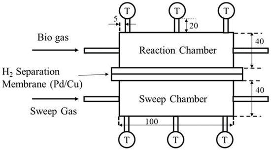 In addition, it is important to operate at a lower temperature for the improvement of the thermal energy efficiency of biogas dry reforming since biogas dry reforming is an endothermic reaction. For this purpose, the use of a membrane reactor is one effective procedure since H2 production is promoted by providing the non-equilibrium state with H2 separation from the reaction space [5]. Several Pd alloy membranes such as Pg/Ag and Pd/Au are commercialized as well as being used for research. However, the costs of Pd/Ag and Pd/Au, including pure Pd, are very expensive. On the other hand, the cost of Pd/Cu is relatively lower compared to Pd/Ag, Pd/Au, and pure Pd. To apply the system proposed by this study to the industry in the future, the cost is important. Therefore, we selected Pd/Cu as the H2 separation membrane. According to the authors’ previous study, the experimental investigation on the biogas dry reforming membrane reactor involved the use of a Pd/Cu membrane and Ni/Cr catalyst. Compared to the pure Ni catalyst, the concentration of produced H2 was higher when using the Ni/Cr catalyst. There is no study to investigate the combination effect of the Ni/Cr (Ni/Cr/Ru) catalyst and a Pd/Cu membrane except for the authors’ study, resulting in focusing on the benefits of using the Ni/Cr (Ni/Cr/Ru) catalyst and Pd/Cu membrane in this study.