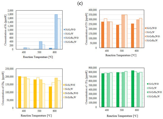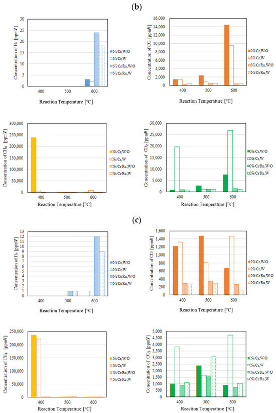 Comparison of each gas concentration in the reaction chamber using the Ni/Cr/Ru catalyst with the Ni/Cr catalyst reaction temperature changing (CH4:CO2 = 1.5:1, differential pressure: (a): 0 MPa, (b): 0.010 MPa, and (c): 0.020 MPa).