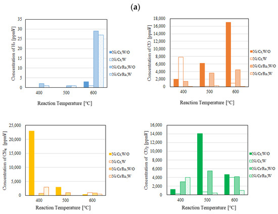 Figure 4 and Figure 5 show the impact of reaction temperature on each gas concentration in the reaction chamber and the concentration of H2 in the sweep chamber, respectively. The differential pressure between the reaction chamber and the sweep chamber was changed by 0 MPa, 0.010 MPa, and 0.020 MPa. In these figures, the molar ratio of CH4:CO2 is 1.5:1. In addition, W and W/O indicate the condition with a sweep gas and that without a sweep gas, respectively, in these figures. Each gas concentration in the reaction chamber and the sweep chamber using Ni/Cr/Ru catalyst was compared to that using Ni/Cr catalyst in these figures. Though this study shows the result of gas concentration in the unit of ppmV, it can be converted into the unit of mol. As to the gas concentration, 10,000 ppmV is 1 vol%. The gas volume can be calculated by multiplying the gas concentration by the volume of the reaction chamber, i.e., 40 mm × 100 mm × 40 mm or the volume of the sweep chamber, i.e., 40 mm × 100 mm × 40 mm. After that, the unit of gas volume, e.g., m3 can be converted into mol by multiplying 22.4 kmol/m3. Since the volume reaction chamber and sweep chamber and the conversion factor of 22.4 kmol/m3 are constant, the authors of this study think that the gas concentration in the unit of ppmV can be used as an evaluation value for the performance of the reaction.