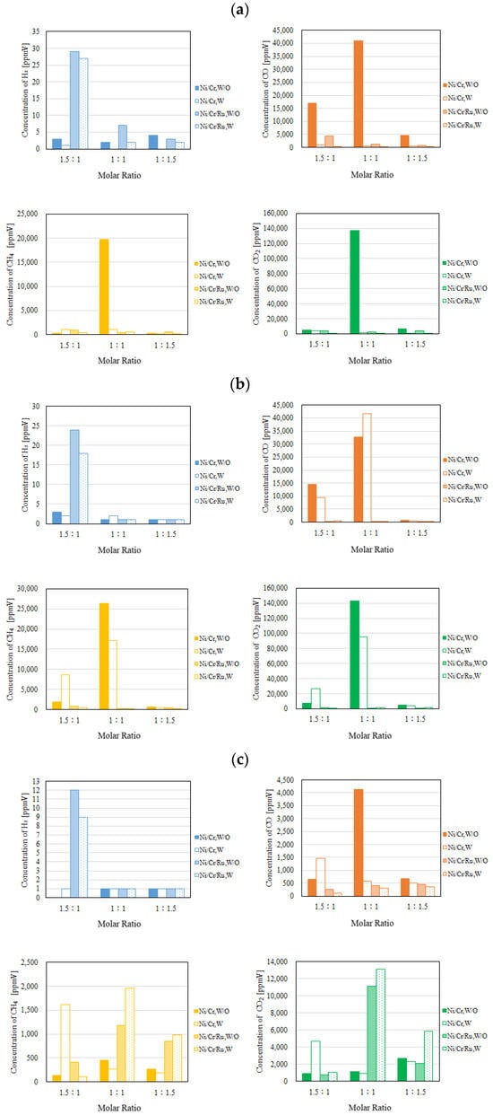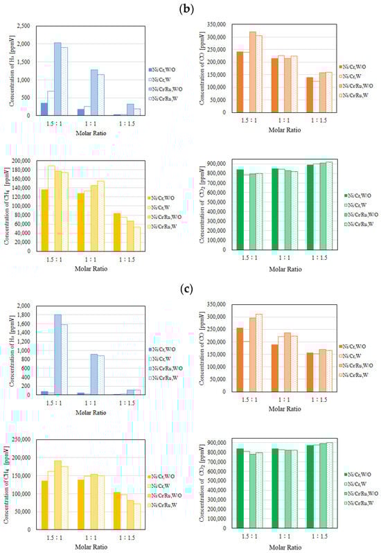 Comparison of each gas concentration in the reaction chamber using the Ni/Cr/Ru catalyst with the Ni/Cr catalyst molar ratio changing (CH4:CO2 = 1.5:1, differential pressure: (a): 0 MPa, (b): 0.010 MPa, and (c): 0.020 MPa).