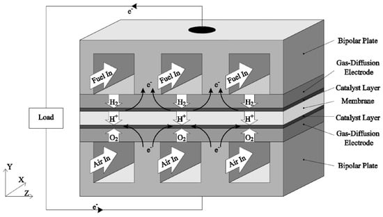 In PEMFCs, hydrogen is internally combined with oxygen from air to create water and generate electricity according to the following reactions: