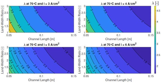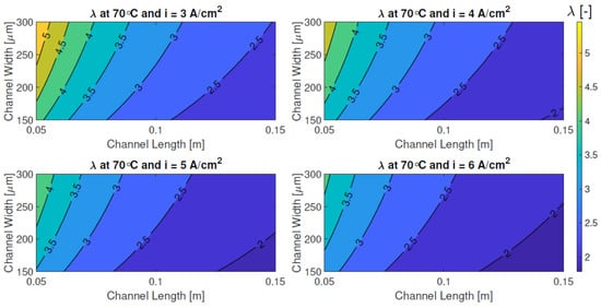 The lower cell temperature of 70 °C results in a higher stoichiometric flow ratio, the general range being between  of 6 for the wide, short channel and under 2 for the narrow, long channel. With increasing current density, the required stoichiometry decreases.