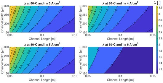 In the case of 80 °C, the same general trend are observed concerning the channel dimensions, but the required stoichiometries are lower, ranging from 3.5 to below 1.2.