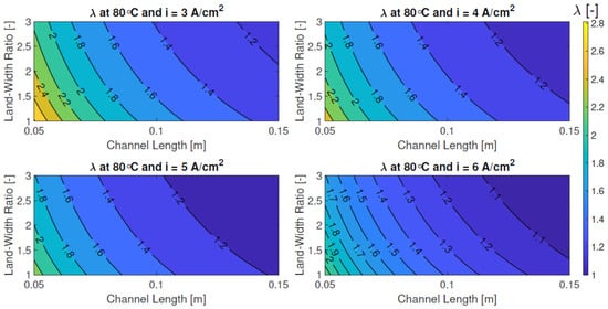 It can also be seen that here, an increase in the land-width ratio leads to a lower required stoichiometry. The reason for this is that every channel section now needs to supply a wider land width with oxygen, but the effect is surprisingly small. For example,