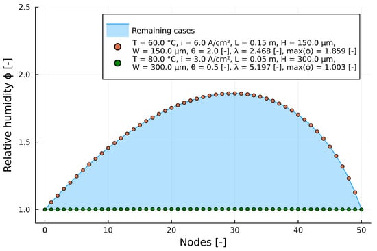 The model also allows for an optimization procedure, given a certain interval of parameters. In our case, we were interested in the best case and the worst case RH distribution along the channel length. In all cases, the inlet and outlet RH was set to 100%, but, as was mentioned above, it was observed that the RH increases to above 100% in the middle of the channel such that undesired channel condensation would occur.