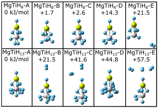Magnesium hydrides have several advantages as a potential solid-state hydrogen storage metal hydride. For example, magnesium is abundant, relatively inexpensive, nontoxic, and lightweight, with a low molar mass [4,14,15,16,17]. Although the strong Mg-H bonding interactions lead to poor hydrogen sorption kinetics and thermodynamics in the solid, the hydrogen storage capacity and hydrogen sorption kinetics in magnesium hydrides have been noted to greatly improve by doping it with transition metals [18,19,20,21,22,23,24,25,26,27,28,29]. Titanium in particular is an attractive catalytic dopant in magnesium hydride systems [21,27]. MgxTiyHz systems of various compositions, for example, have shown to exhibit better (de)hydrogenation energetics and kinetics than both magnesium and titanium hydrides individually, and the hydrogen from some MgxTiyHz materials has been noted to be released from the solid at lower desorption temperatures than other solids [30,31]. However, much is still not fully understood about transition metal-doped magnesium hydrides, including the role of the metal dopant, the required and optimal dopant concentration, and specific details about the desorption mechanism. However, it has been suggested that the dopant atom migrates in the material when hydrogen is released and that the magnesium–metal interactions are critically important during the release of this molecular hydrogen [22,23,24,25,26,27,32,33]. To study real-world bulk processes in greater detail, small atomic clusters are frequently used as convenient models [34,35,36].