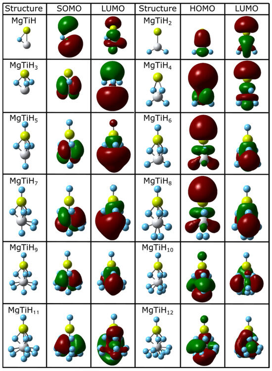 Lowest-energy isomers and frontier orbitals of MgTiHn (n = 1–12). For each structure, magnesium atoms are colored yellow, titanium atoms are grey, and hydrogen atoms are blue.