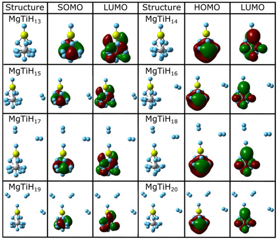 The highest occupied molecular orbital (HOMO) and lowest unoccupied molecular orbital (LUMO), which jointly make up the frontier orbitals for these clusters, are also shown in Figure 2 and Figure 3. These orbitals primarily consist of magnesium p and titanium d character. This is easily seen for smaller-sized clusters, and the frontier orbitals become increasingly complicated as the cluster size increases. For example, in the MgTiH2 cluster, the p and d orbitals of Mg and Ti, respectively, overlap constructively in these frontier orbitals. For doublet species with an odd number of electrons, the singly occupied molecule orbital (SOMO) is denoted for the HOMO, as is common, and is more descriptive for the system. Figure 2 and Figure 3 show clusters with an odd number of hydrogen (doublet systems) on the left side and clusters with an even number of hydrogen atoms (singlet systems) on the right. Thus, similarities can be noted down a column, and the HOMO and SOMO are labeled accordingly for a given column. Note, for example, that once a cluster is saturated with hydrogen atoms (i.e., for MgTiH13 and MgTiH14), the addition of dissociated H2 molecules for larger MgTiHn (n ≥ 15) clusters does not change the frontier orbitals significantly.
