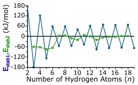 The relative stability of each cluster compares the energy of a cluster in relationship to its neighboring-sized clusters with one more and one less hydrogen atom (or two more and two less hydrogen atoms). These Estab1 and Estab2 relative energies are calculated using Equations (2) and (3), respectively.