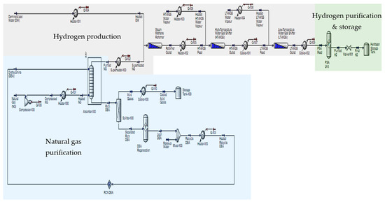 Amine absorption is a widely preferred method for purification due to its high selectivity and efficiency in removing acidic gases, such as CO2 and H2S. Amines exhibit a strong affinity for these acidic components, ensuring effective and selective removal, resulting in high-purity CH4. The scalability of amine absorption systems makes them adaptable for various operational scales, accommodating both small and large purification plants. Furthermore, amines can be regenerated and reused multiple times, enhancing the economic and sustainable aspects of the process [54,55]. The absorbed CO2 and H2S are typically desorbed by heating the amine solution, which can then be cycled back into the absorption process [56,57,58]. This regeneration capability reduces operational costs and minimizes the environmental impact, making amine absorption a practical and efficient choice among commercial purification systems [59,60,61]. Therefore, amine absorption is selected to purify natural gas for hydrogen production using SMR and CLR.