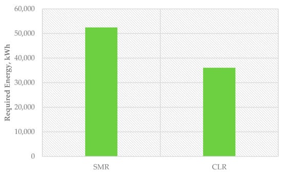 When considering industrial-scale hydrogen production plants, the energy consumption figures directly translate into electricity usage. The required energy for each energy stream is shown in Table 3. The inlet flow rate for raw natural gas is 800 kgmol/h. In the reforming process, a significant amount of energy is required to heat the reactants to the necessary temperatures for efficient chemical reactions [79]. In particular, SMR requires heating water to temperatures as high as 1000 °C from room temperature to initiate the reaction. This process requires substantial energy input because water has a high specific heat capacity, meaning it takes considerable energy to raise its temperature. In contrast, the CLR process involves heating air in the air reactor from around 15 °C to temperatures typically up to 800 °C. The specific heat capacity of air is lower than that of water, and the required temperature increase in CLR is generally less. Therefore, the energy required to heat air is significantly lower than that needed to heat water in SMR. The heat capacity of water is much higher than that of air [80]. Heating water requires raising its temperature and converting it to steam, which consumes substantial energy [81]. In contrast, heating air involves only increasing temperature without a phase change, making it less energy intensive. This explains the lower energy requirements in the chemical looping reforming process.
