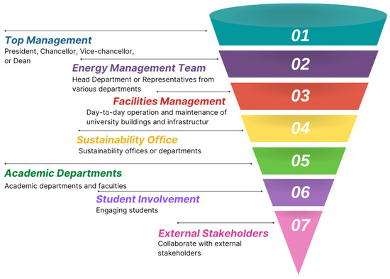 The use of ISO 50001:2018 in higher education provides an organized method for effectively managing energy resources, which aligns with the institutions’ increasing focus on environmental responsibility and sustainability. Universities and colleges can systematically identify and prioritize opportunities for energy conservation, lowering operating costs and carbon footprints, through the installation of an ISO 50001-based Energy Management System (EnMS). This guideline encourages the development of energy policy, senior management participation, and the incorporation of energy management into administrative and instructional procedures. By putting sustainability ideals into practice, educational institutions can also save money that could be used for more academic endeavors and give students real-world examples of responsible resource management. Moreover, ISO 50001’s continuous improvement component fosters a higher education sector culture of continuous environmental awareness and operational efficiency. Higher education institutions can benefit from implementing ISO 50001:2018 in several ways because they frequently have large campuses, buildings, and energy use. This guide (Table 9) explains how to connect the higher education sector to the implementation of ISO 50001 [106,107,108].