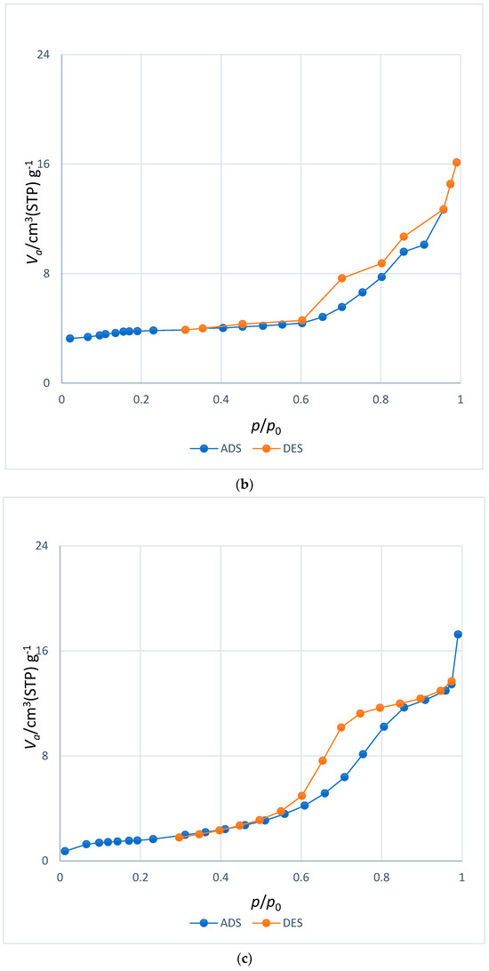 N2 adsorption (ADS) and desorption (DES) isotherms of sulfamethoxazole (a) di phenyl, (b) di butyl, and (c) di methyl tin complexes.