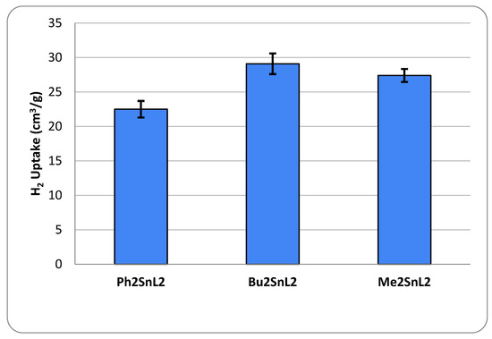 The H2 uptake capacities of the fabricated complexes were comparable to those of polyphosphate and fusidate metal complexes used as adsorbents (Table 6). However, in the present study, high pressure is required to restrict the applicability of the fabricated materials as hydrogen storage media [33]. The mechanism for H2 uptake in both cases involves physisorption, where hydrogen molecules interact with the surface of the complexes through weak van der Waals forces. The surface area and pore structure of the complexes influence this interaction. The L2SnR2 complexes exhibit similar mechanisms due to their structural similarities, as described in the manuscript.
