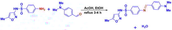 A mixture of 0.01 mole (1.49 g) of aldehyde (4-dimethylaminobenzaldehyde) was dissolved in 10 mL of absolute ethanol. Later, a few drops of glacial acetic acid were mixed with the solution. After 1 h, 0.01 mole (2.53 g) of sulfamethoxazole, dissolved in 10 mL of ethanol, was filled to the mixture and refluxed for 3–4 h. The reaction was observed by TLC utilizing a hexane acetate (3:1) solvent system. After the reaction, the solution was allowed to cool down to ambient temperature, and the colored precipitate was filtered, rinsed with cold ethanol, and dried at an ambient temperature for 24 h. The resulting Schiff base is depicted in Scheme 1.